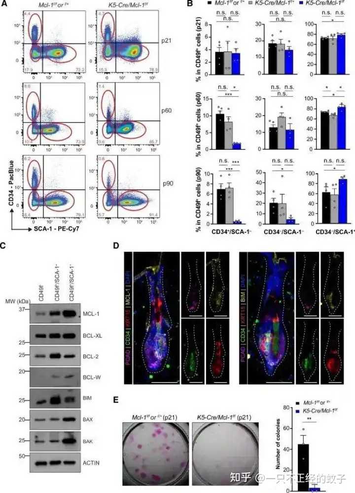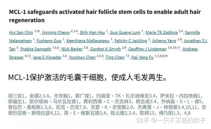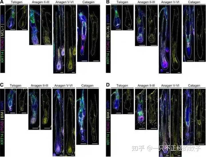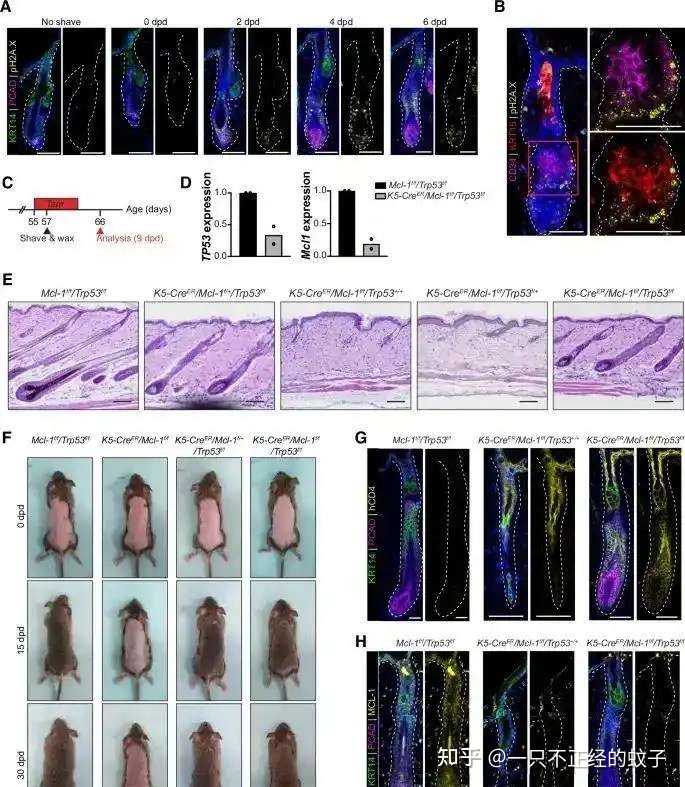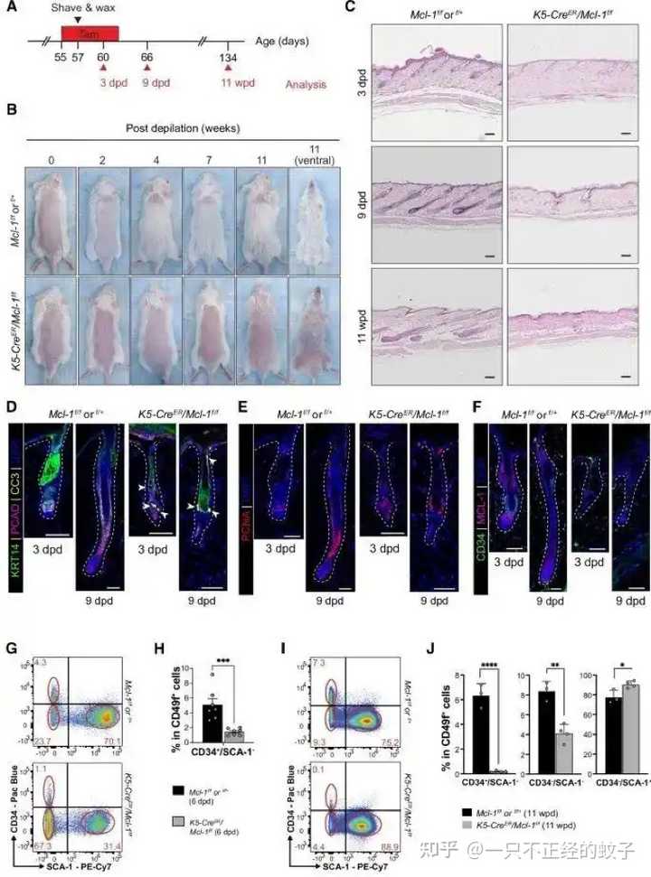 研究者发现,在这项小鼠实验证实的模型中,MCL-1 是毛囊干细胞(HFSC)在激活初期“活下来”的关键。 如果缺失了它,干细胞在尚未完成再生任务之前,就会因激活带来的应激性信号而走向死亡,进而导致毛囊休眠、毛发稀疏乃至脱落。 |