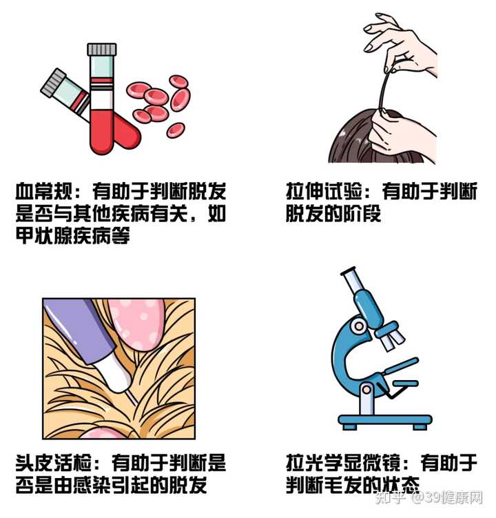Part 2——如何抵抗这一场“秃”如其来的打击? 一句话 心平气和接受不能改变的和能改变的 对抗到底 1、平衡饮食营养元素缺乏会导致推荐食物蛋白质毛囊萎缩牛奶、鱼、虾、黄豆、蛋类、肉类铁休止期脱发瘦肉、南瓜、芝麻、桑葚、菠菜、大豆锌毛发被抑制生长头发稀疏干枯瘦肉、猪肝、鱼肉、蛋黄等维C毛囊周围纤维组织变化,毛囊堵塞猕猴桃、草莓、橘子、青椒、蛋黄 2、专业检查 如果头发掉的厉害 且家族没有遗传 建议去医院做个专业诊治 好对症下药 一般是以下这些项目: |