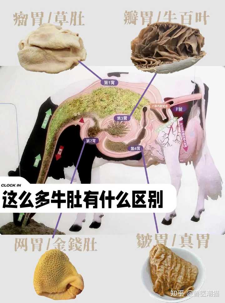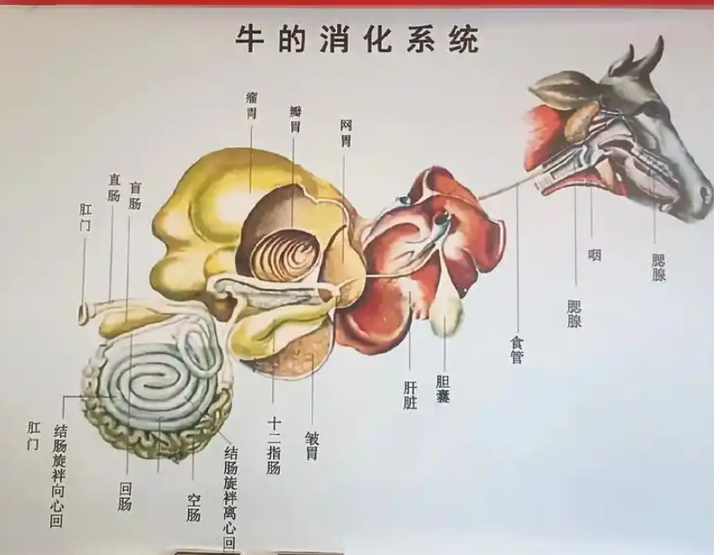 | 顺便一提,同样脆生的黄喉,其实是牛的心管(主动脉)。 最后牛瘪团会进入皱胃,这个胃不大, 功能上和人的胃差不多,主要是用来分解吸收。 餐桌上就叫牛肚,比较厚,一般用来炖汤。 著名养生名菜牛肚炖牛鞭炒牛欢喜炖的就是这个。(有这号菜吗?!喂!!) 所以牛看起来吃的是草,产的是奶,挤的是肉, 其实本体是个大号发酵罐,草吃多少消化多少,有营养。 人不行,压根就没消化纤维素的功能,吃多少拉多少,还废牙。 也只能在十字花科,伞形科,菊科,苋科这几科里挑纤维素少的吃。 不过就算消化不了,人类也很需要, 纤维素可以有效促进肠蠕动,预防防便秘, 营养学还给起了个一听就挺营养的名:膳食纤维。 明明叫see you tomorrow更合适嘛! 当然了,吃不了草我们可以吃牛。 牛要咋样才能壮,就得给喂蛋白料,俗称精饲料。 常见的是豆粕和玉米,有时也喂少量动物蛋白,比如鱼粉之类。 之前老外还喂牛羊骨肉粉,结果容易得疯牛病,给禁了。 但是这个精饲料不能喂多, 为啥咧?牛的瘤胃是个发酵罐,本来就是高度适应草食的。 动物蛋白和淀粉一多,里面的微生物容易失衡, 微生物一失衡,产生海量酸性物质(比如乳酸)和气体。 酸性物质一多,一些本来老实工作的微生物适应不了, 成批被干掉,进一步导致失衡。 过多的酸性物质还会导致瘤胃渗透压升高,酸更难被排出去, 于是就发生了瘤胃酸中毒。 这时牛牛窜稀流涎加倒地,眼见只有进气还有出气, 只能半夜敲兽医家窗户去急救了。 这就是为啥牛不能完全靠吃肉(蛋白质)和粮食维生的原因。 现在主流养殖都会将秸秆,青贮,牧草之类加工成粗饲料, 搭配豆粕,鱼粉,玉米等精饲料进行科学配比饲养。 可以有效防止出现瘤胃酸中毒,俗称谷饲。 通过谷饲这种方式育肥出来的牛肉, 那是肥瘦相间嘎嘎嫩, |