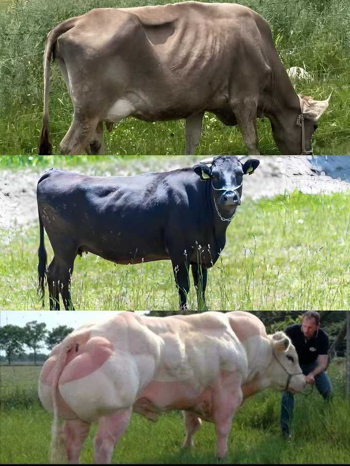 | 从上到下依次是营养不良的老黄牛→氮源充足的神户牛→基因突变的比利时蓝牛 很神奇是吧! 人一口荤不吃确实不太行,除非素食营养搭配特别好,并额外补充维生素B12,要不然真的可能会营养不良早早生病甚至死亡。 但是问题来了,要命的是哪怕人天天吃肉也要配合很大的锻炼强度才能上大肌肉。 |