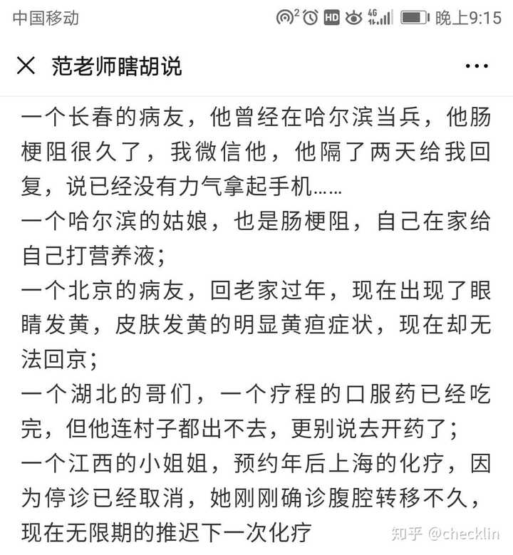 还是有点担忧的,因为疫情严重,华西住院部推迟收治病人,具体情况是怎么样不知道,打了护士站的电话,得知我的主治医不在医院,他所有的病人都交给了另外两位医生。2月6号的化疗不知道能不能准时打上,目前知道有个病友应该1号入院的到现在也没通知入院,希望我能准时入院吧,因为有些医院是先收治姑息治疗和严重的病人,术后辅助治疗的相对延后,不知华西是不是这样,只能等待! 此次疫情真的好严重,最直观的感受是医疗资源好有限!群里有的病友主治医被隔离,真的好可怕!希望少点人感染,快点过去! 昨天凌晨地震,一晚没睡好!摇得我大叫老妈!希望别再地震了! ——————分隔 上次更新2月3日 本次更新2月5日 这两天出血多了,去了妇科急诊,查了血常规,因为左手打了picc管,所有检查抽血都是抽右手。右手抽血已经抽黑了,分不清针眼,今天一直按着上次打的针眼也是特别逗!今天白细胞5.7,红细胞108,凝血正常!上次住过二院的留观,知道怎么观察流血量,自己就把姨妈巾留起来带去了医院称重,所有重量减掉卫生巾重量,从昨天到下午流了26g的血,医生说出血不是特别严重,开了点抗生素和补铁的!抗生素不敢随便吃,因为化疗可能会受影响!能不能吃?联系我的主治医生?联系不到,出院后就跟医院隔绝了一样,有问题找护士站,护士站又不能解决问题。上次打了护士站问主治医的事,护士站找了个医生跟我说叫我挂华西腹部肿瘤门诊,挂另一个医生的话,让她收治我,可是门诊只能现场挂当日号,怎么知道哪天有那个医生的号?当天去抢号?可能天还没亮就要去抢号吧,华西的号,太难了!入院问题打入院服务中心,打了一直在通话中!一直没人接!反正出院医嘱就是有任何突发情况去急诊,病情变化门诊随访!之前的主治医一周坐诊半天,抢号也是个问题! 至于明天的化疗!遥遥无期!华西医院是疫情指定医院,疫情严峻!住院部还没开始收治病人,听另一个病友说9号正式收治,也不知是不是真的,具体情况怎么样未知,也就是说我前面的还没有收治,病友建议我去别的医院打化疗,方案跟华西一样就行,可是连主治医都联系不上也没法跟医生沟通!重点是今后谁负责我未知!病友告诉我化疗推迟不要超过一个星期,强烈建议我挂别的医院的门诊等住院打化疗!既使去外院打化疗,新的问题又来了,那第三次化疗入院怎么办理?因为华西都是当天出院医生开下次入院的预约单!真的挺艰难的,病人难,医生也难!今天的给我看出血的医生也不知道怎么处理我的问题,很能理解他们,病情复杂,为难她了。(上次挂急诊看出血直接给我退号了,说病灶在他们也没办法) 再就是很明显感觉到病情不是特别乐观!真的不知道怎么办!等吧!过两天我好点了再去住院部找我的主治医! 买的临床营养学还没发货!等的啊!老妈实在没有做饭的天赋(在家都是老爹做饭,老妈炒的,emmmmm平时还能吃,化疗后胃口不好,真的得变着法子让自己吃东西),所以今后都要我自己来研究炒菜做饭!期待自己厨艺大涨!毕竟当了那么多年的下手,是时候当个主厨了!最近一个星期没有学习,因为身体状况不好!看书也看的少!心又因为推迟化疗急躁!老妈说我脾气太急,行吧,这次就当是慢性子训练了!现在做的就是让好的细胞长的比癌细胞快,然后跑医院看怎么处理化疗的问题! 愿所有病友的等待都能有个好结果,一定要抗住!疫情早日结束,大家健康平安顺利开始下一轮的治疗! ——————分隔 2月7日 7点半起床一早吃了早饭后,怕跑着腹痛吃了一颗止痛药,带上口罩帽子脑子和勇气,直奔住院部,老妈文化水平有限跑不转医院,她只知道推迟化疗不好,却不知道外院化疗的繁琐!幸好遇见了自己的之前主治医,他说他不带病人了,我跟医生情况不是很乐观,他联系其他医院的医生让我外院化疗,可惜疫情严重其他医院没法收!入院服务中心问了,门诊问了,护士站找了,医生找了!目前的回应是要么外院化疗后重新挂门诊入院要么等通知!那就等呗!我也跑累了尽力了!事在人为,争取了! 中午11点离开华西,直奔363医院(那里人少点,不是疫情指定医院),带老妈看感冒,好几天了,着实害怕冠状病毒!我不知道这样冒死出来对不对,对于疫情而言我不该跑的,对于自己病情而言不得不跑!等到下午两点半老妈的CT出来了,安好!普通感冒!开了点药!从早上吃了饭,下午3点回家,期间口罩没摘过,怕感染,老妈跟我一样一口水没喝,也没吃东西。 对于健康的人而言,这次疫情就是出不了门,对于肿瘤病人来说!是不可想象的!截个范姐姐的公众号,癌症病人的缩影 |