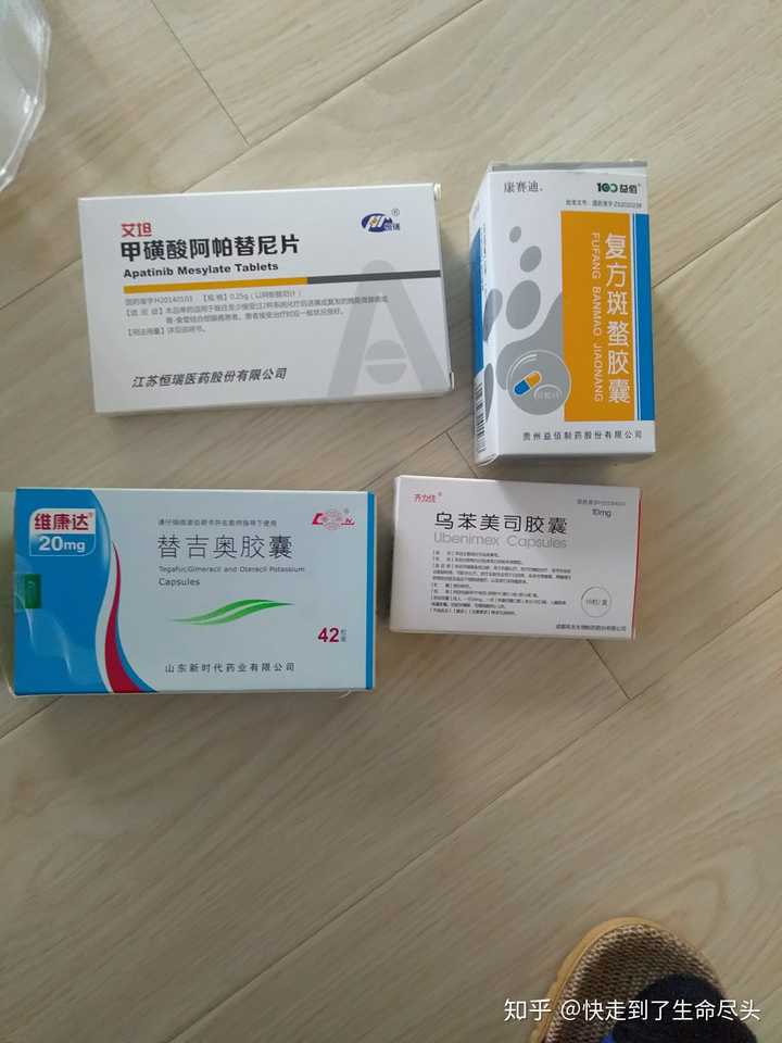 化疗药物 上图4种药是我目前服用的。看说明都有点怕怕 ,前面提到我有天多吃了两颗艾坦阿帕替尼浪费了270元。这种药就是传说中的靶向药,针对性治疗腺癌。医生都明确告诉我,办了证这个药也还是要自费。每盒1348元,一盒十颗,一天两片。 想起这个药能最终买到医保价,在此谢谢福建一位病友。我们是在一个胃癌群里认识的,由于多吃了270元艾坦,所以我跑群里发牢骚。结果他告诉我他在本地买到医保价了,需要重新开证明。 |