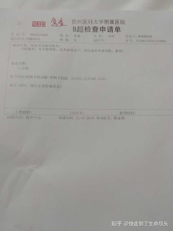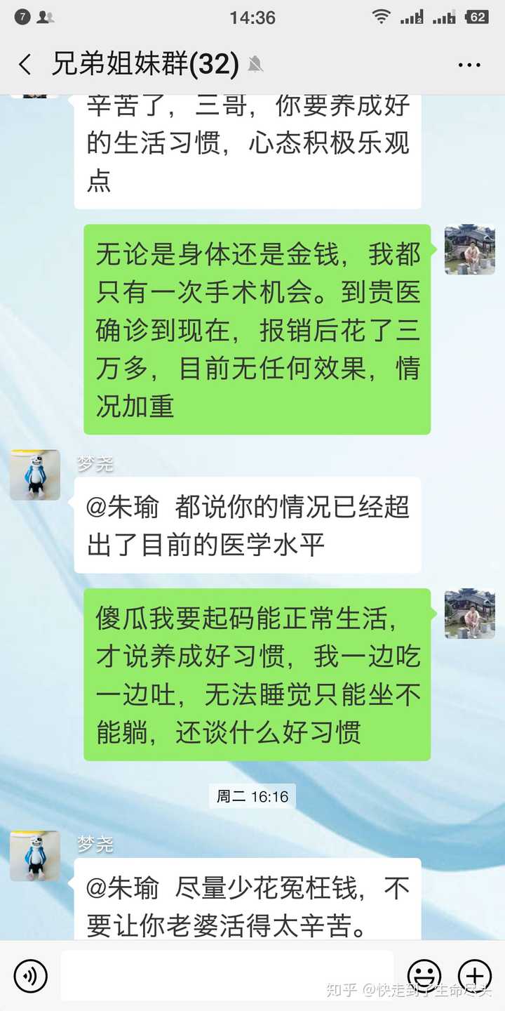 反复考虑是把更新放在上面还是下面,终于还是决定放在下面,因为不停的划动到后面,感觉自己在这里停留过并且呆了很久!我想:知友们也一定希望每一次划到下面都会有新的内容更新,证明我还在这里,证明一个晚期胃癌病人抗癌之路越走越长…… 2019年7月3日 @(~@~)@ ~~~~~~~~~~~~~~~~~~~ 《一》病因,故事的开始 今年春节过后身体上各种奇怪的症状越来越多,手脚长期冰凉,每天夜晚入睡后都会被自己汗水冷醒,睡衣、被子、枕头全部湿透,肚子里面有火烤般的灼热。体力越来越差,大冷天干点什么满头大汗。终于有天胃里面有烧心的感觉,跑进卫生间吐出了大概200毫升鲜血…… 后来的日子身体一天比一天差陆陆续续共吐血六次。我知道自己中招了,手机百度了无数次,答案都告诉我“癌症”。胃癌和直肠癌的可能性最高,其中胃癌的可能性更大。 今天看到知乎提的这个问题,感觉挺好玩,刚好问到了我。当知道得了癌症晚期时候怎么选择?我装作什么都没有发生,家人只是以为我病了,但没有人会往癌症这方面去想,每次吐血我都掩饰得很好,没有谁知道。而我的确也没有拿到诊断书,甚至都还没有去医院好好检查。自己的判断也是来自小度上的各种介绍。 14年因父母年迈,我带着老婆卖掉广东打拼多年买的房子又回到贵州老家。我们夫妻文化都不高,以前在广东靠运气做小生意才赚钱买了套70多平方米的房子。而且还是广东相对普通的一个县级市,那时候房价还不到一千块钱。回来贵州后看到贵阳现在发展还不错就留在了贵阳。本来我是想着用卖房的钱好好投资做点生意,毕竟已经出去快10年,如今虽是回故乡然而却人生地不熟应该先把生计问题解决好,无奈女人对房的那种依赖,对大房子的那种向往,对拥有衣帽间和独立卫生间那种渴求。最终我们当上了“光荣的房奴”。 不知道为什么,回到家乡就没有顺利过,投资做了两次生意都是失败告终,虽然投资也就几万块钱但那已经是我们买房后剩下的全部家当。最终我们做了个推车摆起了地摊,开始了与城管躲猫猫的生活。 结婚八年了夫妻感情不错,唯一遗憾就是没有孩子,也许老天对我生活困难的垂怜,在我们借钱准备好去医院做试管的时候老婆居然怀孕了。然而开心了三个多月孩子毫无征兆的就流产了,老天原来是和我开了个玩笑。 接下来的日子我们就靠和城管躲猫猫辛苦的赚房贷,赚一家人的生活开支。很快两年的期房拿到手,银行在此时搞了个贷款装修的优惠活动,老家的房子也传来消息要拆迁。房产虽是大哥的,但他答应拆迁了给我装修的钱。想想还年轻嘛,虽然摆地摊不怎么靠谱,但是满大街那么多人不都是靠这个生活,只要城管不追,辛苦点收入还是不错的,现在老房子拆迁在即直接不想了贷款装修。 日子一天天过,房贷、装修贷、家用,一个月没有一万二千元,我们根本满足不了所有的开支。老家的房子除了上面写了个大大的拆字,其它的都是遥遥无期……我总是安慰老婆,没事的老房子早晚要拆的嘛,大不了先借钱顶着,拆了还别人。我们的确也是这么做的,能借的亲人朋友都借了。但是还是无法支撑所有开支。哪怕我后来白天送快递晚上帮老婆摆摊,每个月还是赚不到那么多。城管一说有检查,停下来就是一周甚至半月。靠这种没有安全感飘摇的方式赚钱供房,简直就是个笑话。 我慢慢崩溃了,酒成了我最好的伙伴,我想着夭折的孩子,想着憋屈的日子,回忆起这悲哀的一生。就这样我的身体一天比一天差直到吐血后。母亲和老婆都叫我去看看,而我想的是医院这样那样的检查费用估计都够半个月房贷了。我甚至在想也许就是自己想多了过几天可能就好了。直到4月16号,终于还是顶不住了,先去了区医院检查说是我肠子扭转需要动手术,有个半桶水的医生直接给我老婆介绍微创手术,又说要搞个穿刺,听了就不靠谱,全部拒绝了。住了一天还给我插了根胃管,目的是抽干净我胃里东西方便做扭转手术。 被胃管折磨我一个晚上,第二天拔掉转院的时候我感觉人都虚脱了。 |