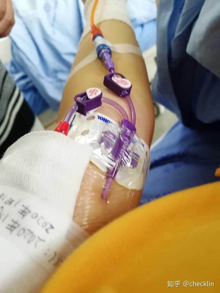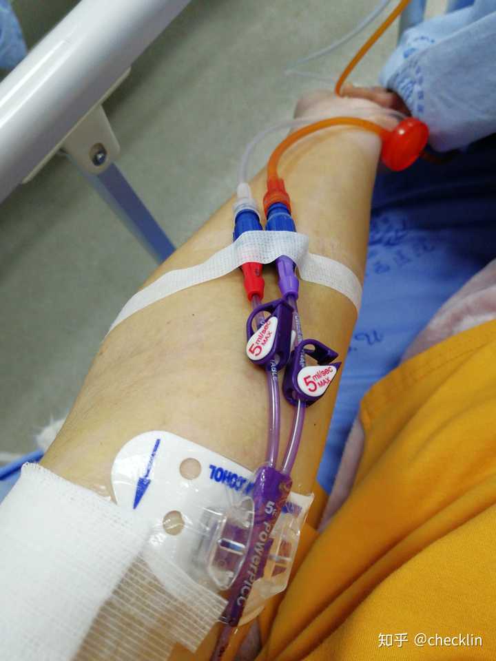 我的亲生母亲来了不到一周想要走了,本打算让她给我煮煮饭送来医院的,因为医生说我有点贫血这几天要吃好补起来,但她放心不下老家的小妹妹,行吧!真的全程要由我后妈(我从头到尾称呼的老妈)来照顾我了!心里没有波澜,又到了一本书《西藏生死书》,一切无常,自己留有一片净土!各有天命,我的天命就是积极抗癌! ——————————分隔 1月16,男朋友提醒我不是15(时间好快啊)今天上化疗药。自己做了点功课,奥沙利铂和多西他赛够我受的!隔壁床的阿姨告诉我打化疗时和化疗后的注意事项,因为她也打过奥沙利铂。奥沙利铂打了后要戴手套,不能接触金属,不然会出现触电现象,奥沙利铂伤神经,出门把自己包的严实点,风吹眼睛都睁不开,吃任何东西都要是温的,水果要泡温了才能吃,期间不能感冒,不能让打PICC管的地方感染,不然可能因为别的问题进重症监护室,那个阿姨一直告诉我别怕,每个人体质不一样,她都挺过来了我这么年轻一定可以挺过来,打的时候特别难受就闭上眼睛冥想。医生告诉我会掉头发,这次出院就剃光头,后面两天估计没力气大段更!但是我会尽量把化疗感觉说的详细点!安好!照顾化疗病人的朋友希望化疗时候耐心再耐心一点吧,斜对面的阿姨吐得不成样子!隔壁奶奶打了化疗药后烧到39.2℃!照顾他们的人都非常耐心但也非常折腾!好心疼!希望我老妈也能挺过来不要因为我累出病!附一张图,让大家见见PICC管,可以放身体里放好几个月 |