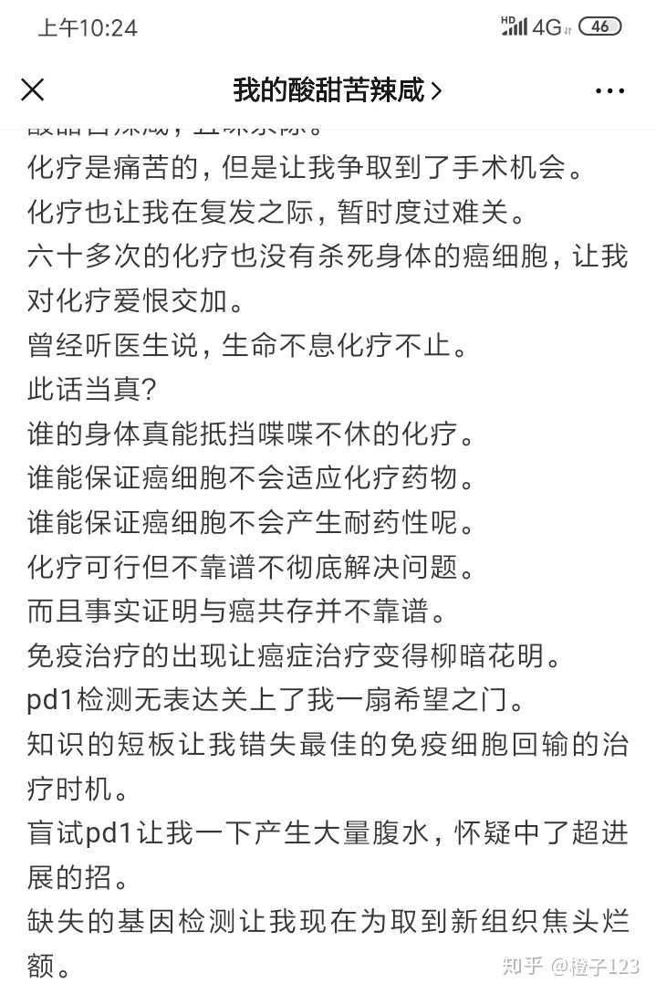 感谢基友的到来,生活增添了恋爱的气息!10年前,在厦门的忠仑公园站和西林云顶站等公车回家,坐在马路边上,看着一辆又一辆的爆满的公车来了又走,我们想坐同一班不挤的。今天坐在窗边,在成都,类似的场景,叫到“邓纸啊……”,哽咽了,想说“我好幸福”,泪水忍不住掉了,幸福的眼泪啊~ 希望下午,的检查结果指标正常! ————————分隔 3月10 昨天结果不好,因为加大了化疗药白细胞跌到2.98,但是红细胞108,即便流血流成这样,红细胞还稳住了。我有心情我就回答,有时候生活看似有选择,其实生活让你没有选择,必须要坚强努力砥砺前行!回答这位知友的问题,也许你在评断的时候,别人的衣食住行可能还没有解决!《了不起的盖茨比》中的一句话“当你想批评任何人时,你要记住,这个世界所有的人,并不是个个都有过你那些优越的条件” 我出生在农村,自我出生父亲就外出打工,6岁母亲出去打工。我跟爷爷奶奶生活,到9岁,被接去厦门,到厦门的第一天我哭着给我奶奶打电话我说我要回家。9岁到11岁,我的大姑姑带我,不是我父母带我,原生家庭给我带来太多伤害;12岁爷爷肠癌离开;我想自己独立,懂事,养活自己和奶奶;17岁,奶奶去世,唯一的感情支柱走了,高考前一个月;18岁大学,相遇自己的爱情,一路走来只有自己知道自己付出了多少……;我想考研,赚更多的钱,才能抗住风险,才能结婚生子孝顺父母……我想挣脱一切……然而自己一点一点长大,家里的变故越来越多,境况一天不如一天,直到最后我病了。 我的重组家庭,直言不讳,我很满足,如果说解决了衣食住行,我想近几年我家的变故仅仅挺留在温饱,我想分担父母的压力,我想好了考研贷款读书,遇到我的老妈是我这辈子很幸运的事!今天早上老妈说,你不要想那么多,还有老妈陪你,带你去贵州三姨外婆那里,把管撤了我们就回厦门…… 我反思我为什么会生病,医生说至少10年了,我的高中语文老师一直在宽慰我,如果说医生说已经有 10年了,那么到今天这个现状是注定的,可惜明白的太晚,放下的太晚,10几年好像在为自己活又好像在为别人活,现在就为自己活呗,今天我还是醒了,还有朋友关心我检查结果。 低分化粘液腺癌伴印戒细胞癌,为什么会得这两种?为什么是库肯伯格转移?问天问地问自己,还是好好活着吧!有药就去拼,别想太多,再不服气的也会放下,放下才能前行。 基友的到来让我一步一步宽慰,放的越来越开,今天也要努力吃饭,争取不流血!奥利给!昨天跟基友看了张伟丽的夺冠视频!奥利给啊!明天要去华西二院找医生,打升白针!奥利给!加油!所有今天要奥利给! ————————分隔 今日特更,如何释怀自己无法放下的,我的高中语文老师说:“因上努力,果上随缘,以无所得之心做人做事,不粘着,不执著,一切随风”。一切随风~一切随风~~ ——————————分隔 3月11日 今天见了尹教授,因为出血问题腹部肿瘤导致的出血腹部肿瘤医生无法处理,建议找妇科试试有没有什么办法,所以挂了她的号,再就是她一直很关心,想告诉她我的近况,是她给我确诊的宫颈癌,二院时也在她的医疗小组。她还是那么和蔼可亲,给我做了妇科检查,开了b超看肿瘤情况,情况并不好。尹教授想通过妇科肿瘤的局部治疗,介入治疗还有别的什么的,配合华西全身化疗,以缓解腹部肿瘤的发展,尽量止血,减少痛苦提高生活质量。她给她医疗团队的李医生打电话说明我的情况后,让李医生看看能不能做腹部的介入治疗,然后让我带着材料去找他。 11点40多,见到李医生,他拿走了我的资料袋,让我在大厅等,10多分钟后他和另一个医生出来,然后查看了我的腹部包块,跟我说,我们能帮助你的非常非常有限,我没有不开心,而是很感激,不管行不行,他们不放弃我还想努力。尹教授看完门诊来找李医生,那是12点多,我正收拾打算离开,看到他们4个医生站在大厅,我想跟他们说声谢谢再走,走了过去,他们竟是在讨论我的病以及他们能做些什么,最后的结论还是一样的,他们能做的非常非常有限,还是跟我说去试基因测序找靶点。真的非常感动,掉了眼泪,幸好带着帽子口罩眼睛看不出来的,我跟他们说我想一一抱抱他们,但是疫情不可以,还想留一张照片。 |