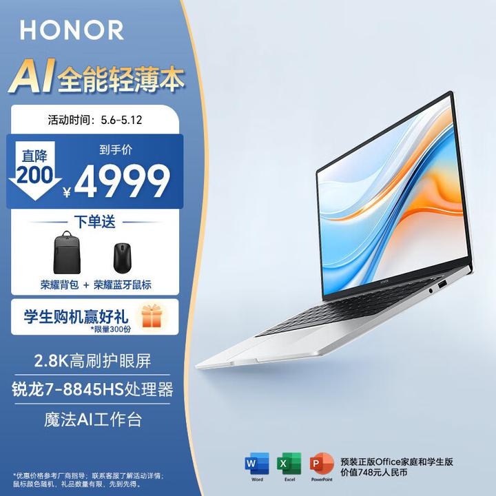 如果你不单对于AI有简单需求,而且更喜欢选一个颜色更时尚,更活泼有趣的机器,那么华硕a豆14 Air 是一个很不错的趣味外观甄选。 华硕 a豆 14 Air 很大程度上是一台针对女生需求的机器,做的非常好,活泼配色外观,能用于日常办公,有着1.29kg的优秀轻薄重量,72Wh大电池保续航,78M核显也能轻度游戏,集颜值与安静于一身,要性能也能推到45W级别,非常奈斯。 荣耀笔记本X14 Plus 2024荣耀笔记本X14 Plus 2024 AI全能轻薄笔记本 14英寸 高性能R7-8845HS 32G 1T 2.8K 120Hz高分护眼屏 |