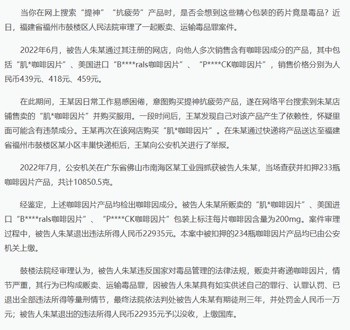 “单独提取茶叶/咖啡豆中的咖啡因,可能构成生产,运输,贩卖毒品罪”,对不少人来说,可能反而会大吃一惊:原来茶叶咖啡里真有毒品的主要成分,本来没人觉得擦边,这么一科普反而擦边了,禁毒办出来回应对霸王茶姬来说简直就是灾难。 有民科跑出来说火箭应该用水洗煤,然后火箭总师煞有介事的跑出来说:我们的火箭不用水洗煤,应该用液氧液氢,但是特殊情况下用水洗煤也不是不行。你猜舆论是记住了火箭用液氧液氢还是火箭能用水洗煤? 而且“不以食用为目的“,这个说法也有点歧义,是说只要以食用为目的,单独提取咖啡因就是合法的吗? 司法实践中肯定不是这样的,下面有一个例子,这个案子是罪犯从国外购买食用咖啡因含片,在某线上平台售卖,这种咖啡因含片显然不是用来吸食,烫吸的,也算不上药品,但是在我国这种含片并不合法,最后案子按照生产、运输、贩卖毒品判的,三年。 |