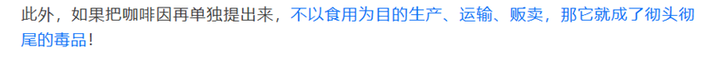 对于咖啡因这种是不是算作毒品和浓度绝对有关的化学物质,更是特例中的特例,尚无明确法律规定浓度/有效成分比例的边界在哪里。 这篇科普文章也没回答,更没法回答这个问题,反而把一个模糊的标准又抛回来了。 中国的GB,也就是强制国标中只允许可乐添加咖啡因,规范是15mg/100ml(150mg/1L),但对于咖啡,茶完全没有标准,运动饮料,比如魔爪用的是咖啡豆提取物来卡bug(瓜拉纳提取物)。国家不允许其他饮料中单独添加咖啡因,但对于含有咖啡因的天然提取物没有上限要求,多少是超标,没有规范规定。 这件事闹大的结果,可能就是国家监管机构开始对咖啡因进行定量的分层以及特殊的管理,以及法律的完善。 马逆本意是坏的,没想到马黑执行好了。 送礼物 还没有人送礼物,鼓励一下作者吧 |
