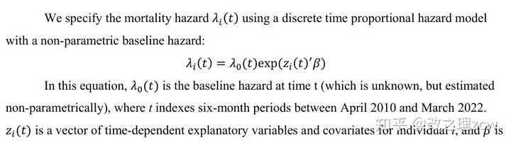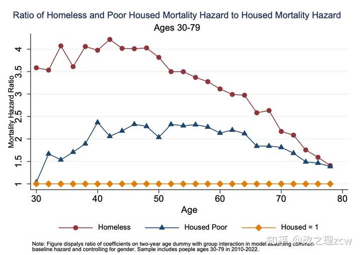 以初始年份为1,黄色和蓝色分别为有房者和有房穷人的存续比例,而红色就是我们关心的流浪汉的存续比例。 我们发现在2022年,有84.2%的流浪汉存活了下来。 恭喜,绝大多数流浪汉显然能够存续12年! 我们还可以看出,这个数据是以6个月为时间单位而统计的,曲线上的每一个点就是6个月,2个点就是1年。 那么流浪汉在第1年其实基本上都可以活下来,在第5年的存活下来的比例我目测在90%以上。 所以流浪汉5年内死亡,肯定是谣言了。 但我们还需要注意,这不意味着流浪这个状态对人的寿命没有什么影响,12年来,有16%的流浪汉死去了,而有房者只有4%死去,有房的穷人只有6%死去,这个差距是非常非常非常大的。 实际上,这篇文章采用了比例风险模型估计流浪汉的“死亡风险”(mortality hazard) |