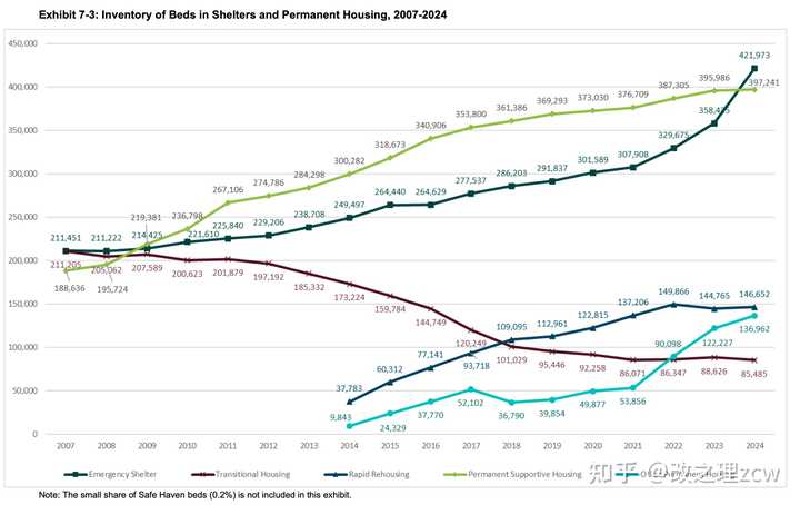 从图中可见,以有房者为基准,流浪汉和有房穷人的相对死亡率都是倒U形的,在50岁以后,相对差距都显著下降,70岁的时候,流浪汉的死亡风险与有房者差距很小了,与有房穷人几乎没有差距了。 在长期,大家都死了,我觉得这个道理,一个智力正常的人都应该可以想明白吧? ps2 还有朋友还在纠结这个没有庇护的统计不到的问题,实际上,这篇文章的数据有庇护的,也有没庇护的,我看了一下它的数据中有庇护的比重是46%,大多数还是没有庇护的。作者认为二者的比例和HUD是一致的,实际上HUD里有庇护的更多,占到3分之2,我觉得主要是它排除了18岁以下的人群,18岁以下的人群96%都在庇护所。 还有朋友说到庇护所清退的问题,其实庇护所的种类有很多,HUD提到针对流浪汉应急或转换身份提供了多种庇护,分别为应急避难所、过渡住房、快速重新安置、永久性保障性住房、其他永久性住房,这几种在2024年的数量分别是42万、8.5万、14.6万、39.7万、1.3万,加起来100多万,而当年统计的流浪汉人数是77万。 |