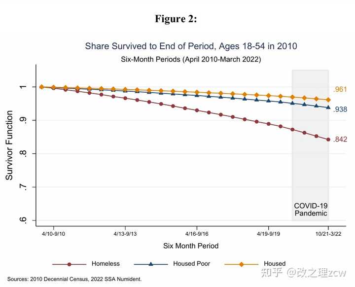 简单回答,就是2010年处于流浪状态的典型人群,84.2%能够活到2022年。 关于这方面的研究,比较有参考价值的应该还是这篇: Meyer, Bruce D., Angela Wyse, and Ilina Logani. "Life and death at the margins of society: the mortality of the US homeless population."Review of Economics and Statistics(2025): 1-46. 因为他们声称自己是第一个估计了流浪汉准确死亡率的,而且是样本最大,最具有全国代表性的: This paper provides the first detailed and accurate picture of mortality in the U.S. homeless population. Our approach centers on 140,000 people who were experiencing sheltered or unsheltered homelessness during the 2010 Census, by far the largest sample ever used to study this population’s mortality and the only sample designed to be nationally representative. 他们追踪了140000名流浪汉2010-2022这12年的情况。遗憾的是,他们没有真的计算这些流浪汉的生存时间,但是我们可以看到到2022年为止,有多少流浪汉活了下来: |