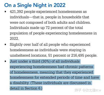 作者指出,在初始年份,死亡风险是0.38%,而在2022年,提高到了1.19%。 但即使已经提高到这么高了,对寿命的影响可能没有我们想象的那么大。 因为我依稀记得,如果是指数分布,死亡风险的倒数可以衡量平均存续时间,按照这么计算, 1除以0.0119等于84,时间单位是6个月,换算成年,等于42年。。。。 (不知道算的对不对,欢迎批评指正!) 显然,是因为40多岁的流浪汉还没有到死亡率大幅提升的年纪,根据作者的估计,无家可归可能使得流浪汉的死亡风险相当于老上18岁,一个40岁的流浪汉死亡风险提升到58岁有房者的水平,而58岁的有房者,死亡的风险还是相对较低。 而我们的模型其实没有假设死亡率会在人衰老之后加速提升。 另外,网传的的这个平均存活5年,我个人比较认可的一种说法是,这是对流浪状态平均存续5年的误读。 因为这些人假设,一旦成为流浪汉,就一辈子也翻不了身,一辈子都是流浪汉。那么不是流浪汉的状态了,只有一种可能,就是死了。 我们可以看到,根据The 2022 Annual Homelessness Assessment Report (AHAR) to Congress的统计 |