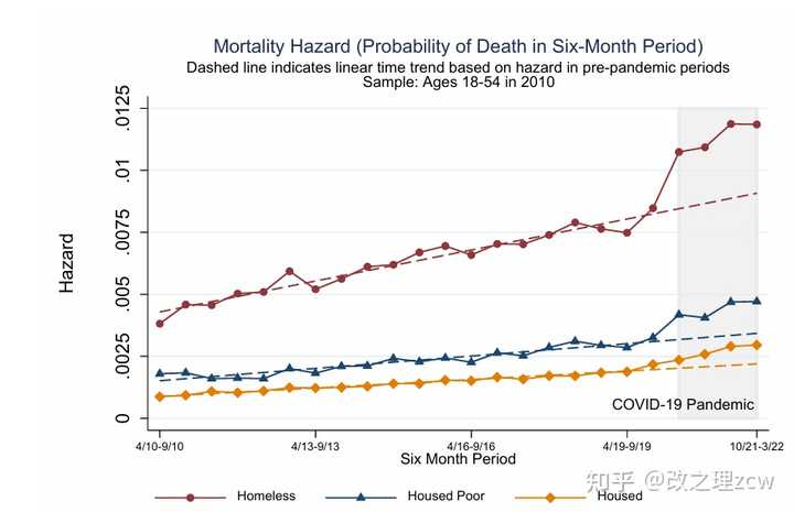 我们可以看到,在新冠肺炎之后,流浪汉的死亡风险大幅提高: |
