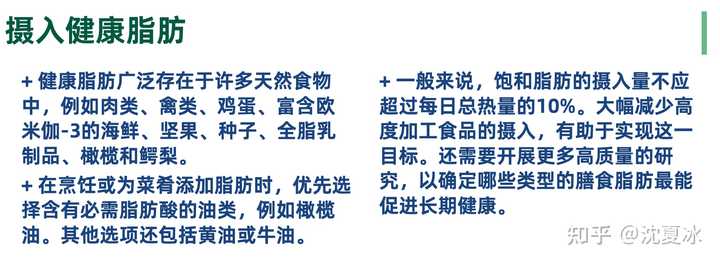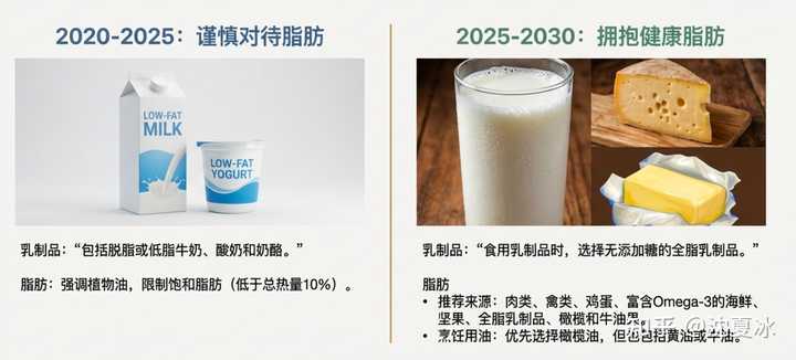 这里最大的变化,是美国把蛋白质推荐量从每日每公斤体重0.8g/d,上调到了每公斤体重每天1.2g~1.6g。 这里其实包含两个问题:1.为什么之前这么低 2.为什么现在这么高,安不安全? 先说为什么之前低,因为之前的0.8g,是按照人群不会出现蛋白质缺乏的标准来设立的,即你可以理解为满足日常健康需求的蛋白质摄入的下限,我们国家以植物性食物为主,很长一段时间蛋白质摄入量也都是每公斤体重每天0.8g~1.16g。 这次膳食指南修改蛋白质摄入,是因为发现「更充足的蛋白质摄入」,能够有助于维持瘦体重和促进代谢健康,这其实是是一个获得更健康身体状态的的目标。 那这次提高蛋白质摄入量的标准,依据是什么呢?膳食指南科学证据文件中也提到: ①研究是RCT,中高质量 ② 2/3的高蛋白质摄入组的体重相关指标表现更好 ③没有不良反应 在一项对30项随机对照试验的系统综述,探讨了高蛋白饮食对成年人体重管理和营养充足性的影响(详细方法与结果见附录4.9)。 高蛋白饮食被定义为每公斤体重摄入1.2至1.6克蛋白质,而对照饮食则为每公斤体重摄入0.8至1.0克蛋白质。大多数试验是在限制热量摄入期间的超重或肥胖成年人中开展的,另有几项小型研究针对体重稳定的成年人。 在持续12周至2年的各项试验中,67%的试验报告至少在一个与体重相关的指标上出现了显著改善——通常表现为脂肪减少更多、瘦体重得以保留,或体重减轻后的维持效果更好;而所有试验均未显示任何不利的体重影响。标准化均值脂肪量减少的差异为?1.31千克,而瘦体重保持则增加了+0.81千克。 这两项结果的证据等级均为中高。大多数干预措施通过富含营养的动物源性蛋白质提高了蛋白质摄入量。在本研究范围内,尚未观察到对肾功能、骨骼健康或代谢指标产生。 至于摄入量的上限,也调整到了每公斤体重每天2.5g蛋白质。 由于缺乏高质量的研究而确立。239 成人每日膳食中脂肪的可接受宏量营养素(AMDR)分布范围上限为35%,这大致相当于每天每公斤体重2.5克。 另外,从来源上说,新指南的建议是:无论是动物性还是植物性蛋白质食物,都能提供人体必需的营养素;只要以加工最少的形式食用,它们均可成为健康膳食模式的一部分。 我的看法是,从蛋白质总量来看,健康成年人每公斤体重每天摄入1.2~1.5g的蛋白质并不算负担很大,但需要考虑的是「可执行性」,尤其是对于低收入人群而言,获取优质蛋白的难度和成本会更高。 另外,大幅度提升红肉、全脂乳制品的摄入量,很可能会不可避免的增加饱和脂肪的摄入,而指南其实又格外强调「不建议通过高加工进度的“蛋白粉”来获取蛋白质」,所以实操层面其实问题非常大。 4.「细则变化2」:提倡从全食物中获取健康脂肪,包括牛油或者黄油 |