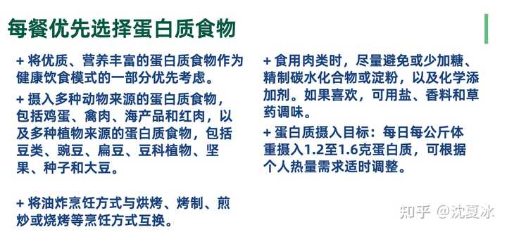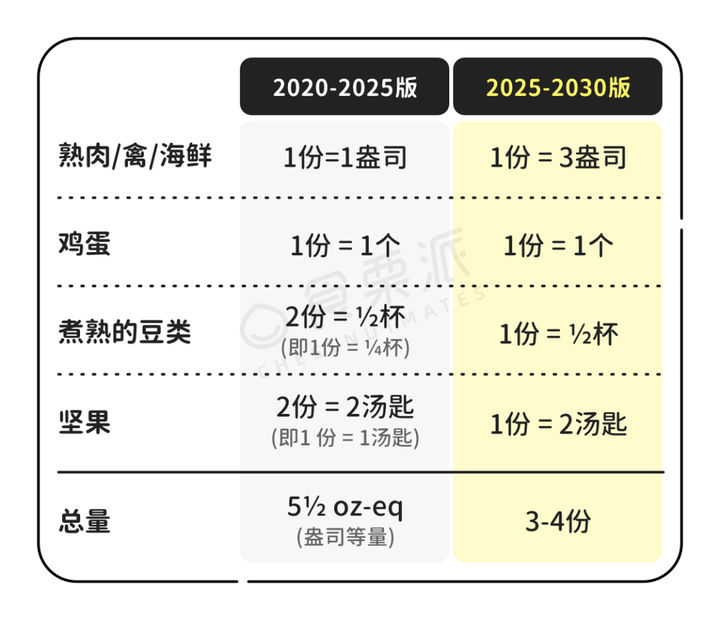 2011——2025 如果对比第一个和最后一个,你会发现金字塔完全倒了过来! 2011版本的我的餐盘,提倡的是「全谷物」、「水果」、「蔬菜」、「蛋白质」、「低脂奶制品」分别按照一定的分量放置在餐盘重。 而到了2025,新版的膳食宝塔就是: 优先选择优质蛋白质、健康脂肪、水果、蔬菜和全谷物,同时避免高度加工食品和精制碳水化合物。 优质蛋白+优质脂肪 > 蔬菜水果 >全谷物 ①每餐优先选择优质蛋白来源,用肉类、奶类中的优质蛋白和健康脂肪,填充每日饮食的大部分 ②全天多吃新鲜的颜色鲜艳的蔬菜水果,填充每日饮食的另一部分 ③适当的关注全谷物,用高纤维、低加工的全谷物,弥补日常剩余饮食的部分 谷物的分量少了多少呢?我们对比下2020年的指南,当时在2000kcal下,全天还建议摄入6份的谷类(包括全谷物),而到了2025年的新版的膳食指南,依然是2000kcal的能量等级下,谷物的比例下降到了2~4份,减少了接近一半。 这个模式其实很难评,因为食物整体比例的变化,导致整体膳食的宏量营养素比例一定会往高蛋白、高脂肪和低碳水化合物的方向偏转...但总体而言和「生酮饮食」还是有区别,我估算了下碳水:脂肪:蛋白质 ≈ 4:4:2 3.「细则改变1」——提倡优先摄入蛋白质,提高了推荐量 |