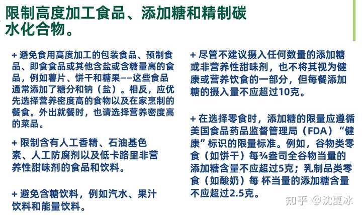 营销号都不敢这么写 我完全不同意把「意大利面」归到糖的范畴,毕竟硬质杜兰小麦蛋白质更高,摄入后消化吸收速率更慢,和糖还是有本质的区别的...但想一想第一性原则(天然食物>>加工食物),你也能想到为啥精制谷物会被“唾弃”了.. 而且考虑到我国整体的饮食习惯和食物喜好,这条基本上没有任何参考意义,最多就是鼓励大家「认清真正的全谷物」和「多吃全谷物」罢了... 6.「细则变化4」:限制高加工食物、添加糖和精制碳水,不建议摄入任何甜味剂 |