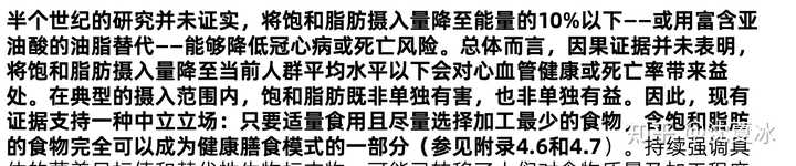 美国膳食指南科学证据 P27 同时,新指南委员会认为:饱和脂肪的并非「单独有害或者有益」,只要尽量选择少加工的食物,含有饱和脂肪的食物完全可以成为健康膳食的一部分。 |