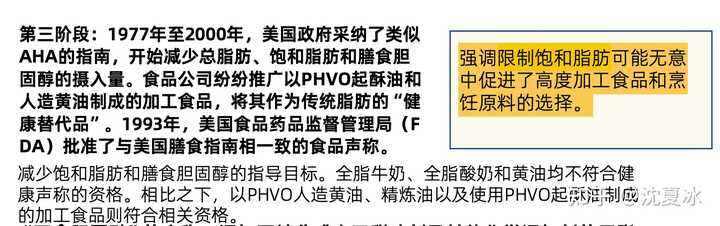 这一条是目前争论最大的,包括美国营养和饮食协会、美国心脏协会(AHA)等其他机构,都对此表示出了顾虑,主要在于: 新指南一边强调黄油、牛油、红肉和全脂乳制品要充足摄入,另一边控制饱和脂肪摄入量在10%以下,这明显「自相矛盾」。 那新指南会推崇黄油、牛油呢?很简单,是因为牛油是完整牛肉的一部分、乳脂来自于全脂牛奶,如果因为因为担心饱和脂肪过多,限制牛油和牛奶中乳脂的摄入,就很有可能会因此影响到「牛肉」和「全脂牛奶」这些天然食物的摄入,并且可能让我们多摄入了「工业植物油」,这就违背了刚刚我们讲的「第一性原则」。 |