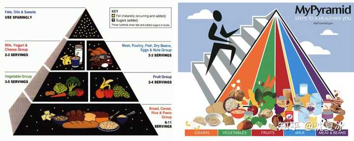 美国膳食指南2020-2025 而在2025-2030的新版美国膳食指南中,「回归选择天然食物本身」的优先级大于一切。 让美国再次健康(make American great again),为了让美国重新恢复健康,我们必须回归基本。美国家庭必须优先选择以全食物、营养密集型食品为主的饮食——包括蛋白质、乳制品、蔬菜、水果和健康脂肪.... 至于为什么要回归天然食物,指南原文也给出答案了: 几十年来,联邦政府的激励措施一直推动低质量、高度加工的食品为主的「标准美国饮食」,这使得美国现阶段处在紧急状态下,近90%的医疗支出用于治疗患有慢性疾病的人群... 所以,在特朗普政府领导下,我们重新调整我们的食品体系,以天然食物为中心,启用新的饮食金字塔,呼吁每位美国人多吃真正的食物,进而滋养身体,恢复健康,激发能量,促进运动与锻炼,增强体魄..... 这里其实预设了一个因果关系,即「之前指南提倡加工食物,缺乏科学性」——「所以米国“病了”,人民处于慢性病的水深火热里」——「我们要颠覆原有指南,鼓励天然食物」——「让米国重新健康」 非常有川宝特色! 我不是说鼓励天然食物不对,我只是觉得政府可能自己也高估了膳食指南这件事情的影响力,本身「指南」就是指导方针,不是强制执行的法规条例。说白了,就好比我们出门玩导游塞在我们手上的地图,建议我们走哪条路去哪里玩更好,但其实大部分时候我们并没有完全按照地图走。 饮食这件事也一样,影响选择的因素也太多了。 因为饮食模式对健康有明确影响,这件事有太充分的证据,无论从地中海饮食、DASH饮食,还是到我们自己的平衡膳食,对于心血管、健康寿命都有明确益处。 所以我倾向于把新旧指南的核心原则结合在一起,即强调「饮食模式」的同时,让大众回归「完整、基础、天然的食物选择」当中。 2.「膳食宝塔」:从「我的餐盘(Myplate)」,变成「倒金字塔(Diet pyramid)」 下图是四个不同版本的美国膳食宝塔(餐盘) |