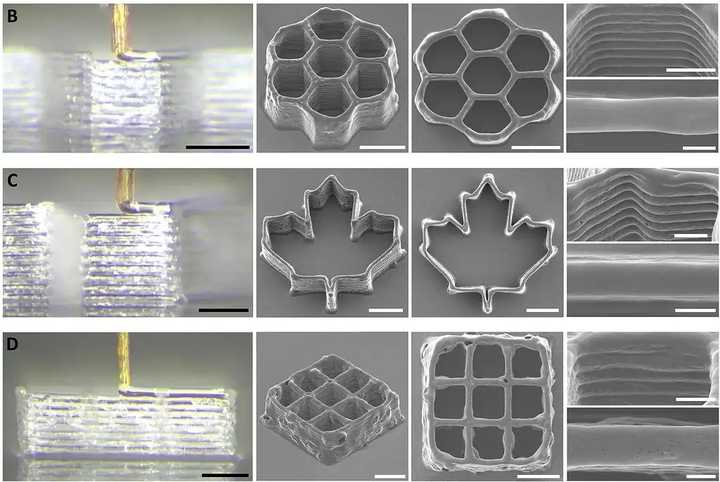 在经过仔细对比之后,蚊子的嘴,或者更严谨的说,蚊子的口器最终“胜出”,研究人员发现,它们的口器足够细、足够直,还具备非常好的强度和韧性,并且其内壁也非常平滑,能够让流体极为顺畅地通过。 所以从理论上来讲,蚊子的口器,可以说是堪称完美地符合了微米尺度的3D打印喷口所需要的条件。接下来,就是实验阶段。 在实验过程中,研究人员选择了埃及伊蚊作为供体,他们小心翼翼地取下这些蚊子的口器,并对其进行了清洁处理,然后在其外部加了一层类似于“外骨骼”的支撑材料,以避免它们在使用过程中变形或断裂。 经过一系列精细操作之后,蚊子的口器就被做成了微米尺度3D打印喷口,接下来,研究人员将其安装在特制的3D打印系统上,然后对其进行测试。 在测试工作中,研究人员利用这种喷口打印了多种微米级的结构,例如规则的网格、复杂的图案,还有可用于包裹细胞的微型支架,结果表明,其打印效果简直是绝了。 |