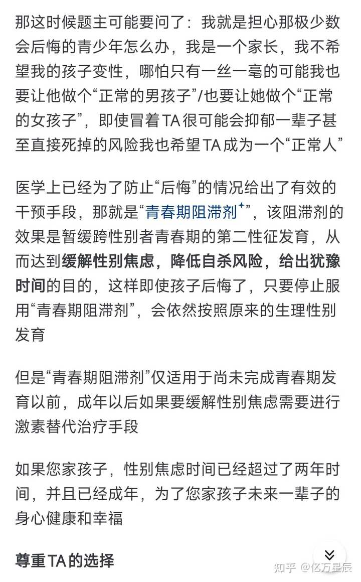 我看见不少说不要碰这些,你都是被骗了的。 很多人对于激素代替治疗和性别认同问题有着严重的误解。很多人认为跨性别(药娘)吃糖是为了变好看。但大部分人/男娘本质上还是认同自己是男的,自然不会厌恶自己的男性特征。而跨性别不一样,你不知道她们有多么厌恶自己的男性特征。(就像你不知道劳保家长多么厌恶孩子的拥有女性特质一样) 跨性别激素治疗的目的只是为了让自己好受些,让自己能少点皮肤出油,抑制毛发,改善脂肪分布,乳腺发育等。 并且激素代替治疗(HRT)就是目前最正规的治疗手段。而手术是它的后续。Hrt和手术是先后关系,不是并列关系。(并且你想手术的话你是要去开证的,你开证也是要hrt的呀) 更何况哪有那么多被骗的啊,一谈到这个,很多视频的评论区下面就会说:“活过20大寿,我出100万” 大部分不了解这个的,都认为他会减少寿命,没有性别焦虑的,谁闲的没事吃这个啊? 还有人想知道hrt有必要吗,会伤身体吗。 性别肯定治疗是可以降低跨性别群体的自杀倾向。你见过哪个抗抑郁药可以减少73%的自杀率?(JAMA Network Open研究中的73%数据,以及2022年另一项研究中的14.4%数据。) 对身体是有损伤的,但到不了影响几年寿命这种。因为女性化,力量耐力会变小。 一篇2025年的综述确认HRT对心理健康和生活质量有益,但指出跨性别女性相较于普通人群,心血管疾病导致的死亡率有所增加。这些研究均未直接证明HRT本身是导致死亡率增加的原因。过高的死亡率很可能与跨性别社群长期面临的社会压力、歧视、医疗障碍以及吸烟等不健康生活方式密切相关。换句话说,社会性因素可能是比HRT本身更重要的健康风险。 同时还有会不会后悔↓ |