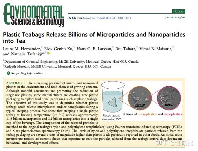 比如塑料茶包,就是有较多的研究。早在2019年,发表在《Environmental Science & Technology》的一篇文章就提出用茶包泡茶可能会释放大量的微塑料,研究发现,在冲泡温度(95℃)下浸泡单个塑料茶包(茶叶袋用尼龙66或者聚酯(PET)做成)约5min,那么你将会得到一杯释放约116亿个微塑料和31亿个纳米塑料的茶中,如果干了这一杯,就会有近140亿个微塑料粒子喝进身体里。 看完简直想翻出家里的茶包泡一包压压惊! 类似的研究很多,不同情况可能加速包装中的塑料粒子释放,比如食物温度从升高时,含油脂食物与塑料餐盒接触时、食物在塑料餐盒中放置时间越久时,都可能使塑料餐盒中的粒子释放加速/增加。 但我们不可能完全拒绝塑料,只能不断降低风险,比如日常少点外卖,尽量避免使用塑料容易来加热或盛放油脂食物,玻璃制品可能是一个不错的选择。 希望最后我们不要变成塑料假人。(手动狗头) |