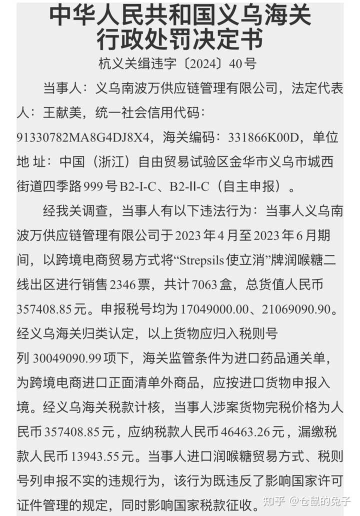 英国人把自己的喉咙止痛药拿到中国来销售,是不是鸦片战争传统艺能了? 我国《药品广告审查发布标准》第七条明确规定: “非处方药广告必须同时标明非处方药专用标识(OTC)。” 请问在睡前消息第1010期里面,有OTC药品的标识出现吗? 【【睡前消息1010】2025全年盘点(下 科技与老朋友)-哔哩哔哩】 经评论区提醒,这款产品确实因为进口报关申报不实而被行政处罚,且海关也认定该产品为药品,而非润喉糖。处罚书全文如下: 中华人民共和国义乌海关行政处罚决定书 杭义关缉违字〔2024〕40号 |