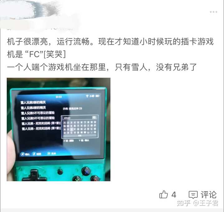 这是我之前想买开源掌机时刷到的一个评论,一下就看得有点恍了神。 小时候玩个电脑都得打报告,去街边游戏厅更是像做贼; 等到现在没人管、可以随便玩了,费半天劲把掌机的系统和ROM刷好,却只会对着游戏界面发呆。 会融化的雪人还在,当年陪玩的兄弟却不见了,九个字写出当代的“桃花依旧笑春风”。 不过拼多多评论区里,更多的还是会心一笑的整活。 入门级: |