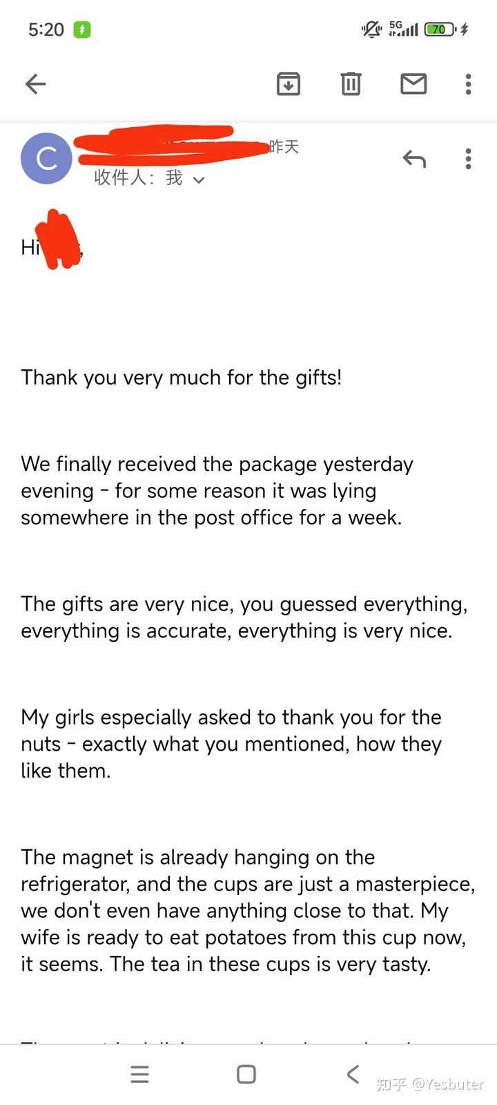 客户收到我礼物给我的回信 后来的后来我老婆经过努力,也通过面试,在一家大学工作,很好的工作。一周3天,早8点到下午3点,2天在家自由上班。工资1500欧到手,200欧饭补,年底两个月还有很多福利,一年到手应该有个20万元左右。主要是真的轻松,能兼顾家庭。而我多亏了第一个客户的支持,我外贸做的也慢慢有起色,客户也多起来,想法也多了起来,自己弄独立网站,找供应商合作,收入也随之好起来了。如今我最大的快乐就是把每次赚的钱取出来,然后拿给老婆,看她开心的样子。 |