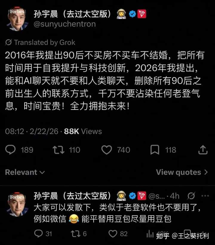 90年的孙哥,已经35+了,在00后眼中,已经是标准的中老登了。 孙哥虽然看着风采依旧,不显老,且分享也接地气,尤其是2016年的分享,但岁月不饶人,用年龄去一刀切的话,已经是符合中老登了。 孙割自己也做不到把90前的人都删了,赵长鹏他会删吗?陈伟星(快的创始人)他会删吗?他不还想请马斯克吃饭炒作?(马斯克是1971年的)。 AI大模型目前的中坚力量,很多都是90前的,比如Anthropic的CEO是1983年的,Andrej Karpathy是1986年的,梁文峰是1985年的。 晚上刚读的橡树资本创始人 霍华德马克思最新的备忘录《AI奔涌向前》,他是1946出生的,接近80周岁了,还能够随手输出万字长文,对AI有了全新认知。 并不是90后就一定意味着是中登,90后思想已经固化的也大有人在,甚至很多00后,思想也很封闭。 至于平时大家和人类聊天,还是和AI聊天,如果是问问题,直接请教AI比较好,如果是了解讯息的话,可能人类会具有某方面的优势。 关于在AI时代,年轻人应该做什么?孙宇晨并没有给出的深刻的见解。 2016年他给的一些建议挺好的,但我后来发现他的分享中其实有很多前人的观点,比如很多关于财富和自由的观点,都来自于哈耶克。 |