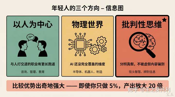 而刚读的Anthropic的CEO Dario Amodei的访谈文章,倒是对AI时代的年轻人提出了清晰的建议。 指出了AI时代年轻人应该提升的三个方向,应该多做以下三种工作:一是以人为中心的工作;二是物理世界相关的工作,不要做数字世界的工作了,会被替代了,去做物理世界的工作,比如当半导体工程师,比如造火箭;三是要有批判性思维,努力提升认知、理解能力和判断能力。 这三条是非常底层的,也是非常重要的,都是从不会被AI替代的角度出发给出的建议。 Nikhil 问:一个 25 岁的印度年轻人,想在未来十年里在资本主义竞争中赢,该选什么方向? Dario 给了三个方向。 第一,以人为中心的工作。 涉及与人打交道的职业有更长的跑道。 第二,物理世界相关的工作。 半导体是一个好例子,有“物理世界”和“传统工程”两个 AI 还没完全覆盖的维度。 第三,也是他最强调的:批判性思维。 当 AI 能生成任何内容,图像、视频、文本,分辨真假变得越来越难。“成功的很大一部分可能就是拥有街头智慧,不被虚假内容骗到。你不想持有错误信念,不想被诈骗。” 他补充说 Anthropic 不做图像和视频生成,“有很多原因,这是其中之一”。 关于写代码和软件工程,他做了一个区分:写代码(写代码的具体动作)会先被 AI 替代,但更广泛的软件工程(系统设计、理解用户需求、管理 AI 团队)需要更长时间。即便如此,他认为这也终将发生。 但他补充了一个反直觉的观点:即使你只做任务的 5%,因为 AI 做了另外 95%,你的产出被放大了 20 倍。"比较优势出奇地强大。"https://weibo.com/ttarticle/x/m/show/id/2309405270939419410574?_wb_client_=1&s_channel=5&s_trans=b38WPc57q9uVRJG%2F8WraXA%3D%3D_s" data-tooltip-richtext="1" data-tooltip-preset="white" data-tooltip-classname="ztext-reference-tooltip">[1] |