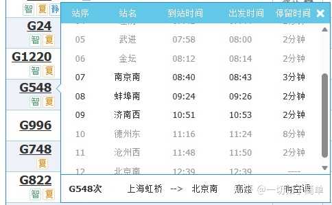 G733比G747中间多停了2个站、累计停车时间还多1分钟,但是比G747的时间还快? 聪明人已经看出来了,G733是跑350的车! 你要说达速350的只有G7XX也就算了,问题是G5XX也有达速度350的车。例如G548,南京南~济南西历时2小时8分钟,历时和中间停一站徐州东的G24一样,肯定是350的车。 |