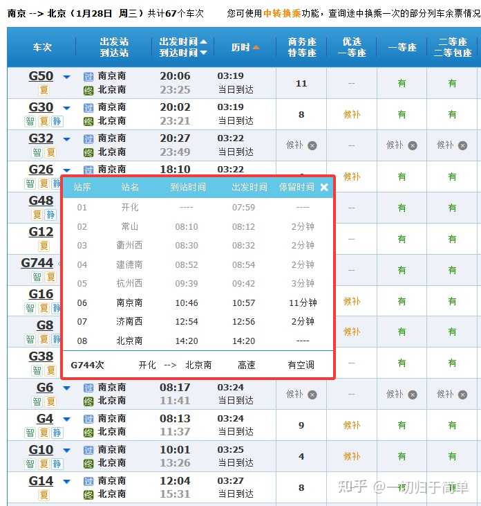 2. 无法从车号看出车速 以前只要看到G100以下的车号,必然是跑350km/h的,但这次显然有不少G7XX也是跑350的车次。 但是我们把南京南~北京南的车次按照历时排序,第一眼就看到了G744这个抽象车,这速度显然是350的标杆,但是用三位数车次号? |