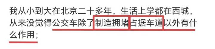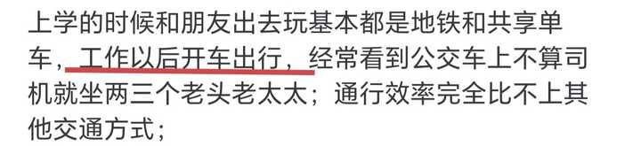 那么公交车具体造成了谁的拥堵?占据了谁的车道?显然公交车作为一种汽车,占据的是机动车道,堵了私家汽车的路。 其他交通方式,例如轨道交通、民航、船舶、行人、非机动车等,不和公交车共用车道。公交车不和他们竞争道路资源。公交车的存在不损害他们的利益,而是多一种出行选择,有利无弊,不会反对公交车。 所以分析推测:本提问是私家汽车对公交车的控诉。 第二段内容“工作后开车出行”印证了我的分析,目前提问者主要是以“私家汽车”的身份参与交通的↓ |