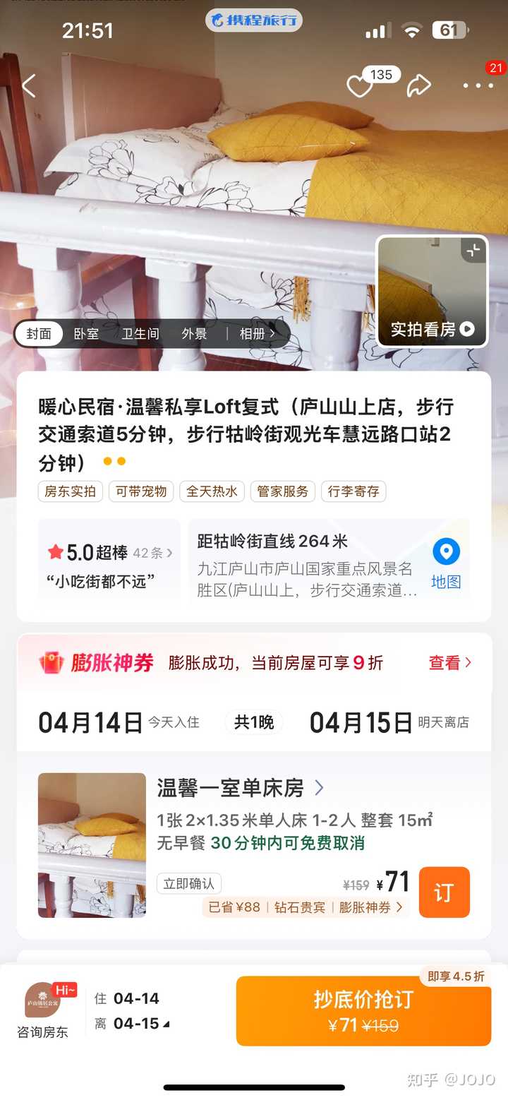 庐山刚去了,这个地方景色感觉一般,但适合度假,山顶有个镇子,住在山上的民宿可以一天不到100块钱,吃的也便宜,一张票管7天,交通票也管7天,就是奔着让你去度假一周的。 和泰山黄山一样特种兵旅游拍照打卡没意思,但当度假地的话真的是圣地,周边环境是我去过的名山里面最好,到处郁郁葱葱,植物园里面随处百年大树,而且整个山奇大,和小城市差不多 上面截图是庐山现在民宿价格,在庐山观光车站附近,虽然是淡季,但看看淡季的黄山多少钱?因为庐山就是成熟的度假地,很大,很大 |