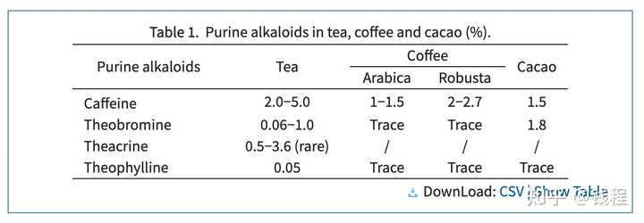 茶叶、咖啡里既含有咖啡因又含有茶碱,但最主要起兴奋提神作用的是咖啡因。茶碱在其中的贡献可忽略不计,因为含量太低。茶叶中可可碱(Theobromine)的含量都要大于茶碱。 干茶叶中咖啡因含量在1.2%~5.9%之间,平均为4.2%。而茶碱含量通常只有0.05%甚至以下[1]。 |