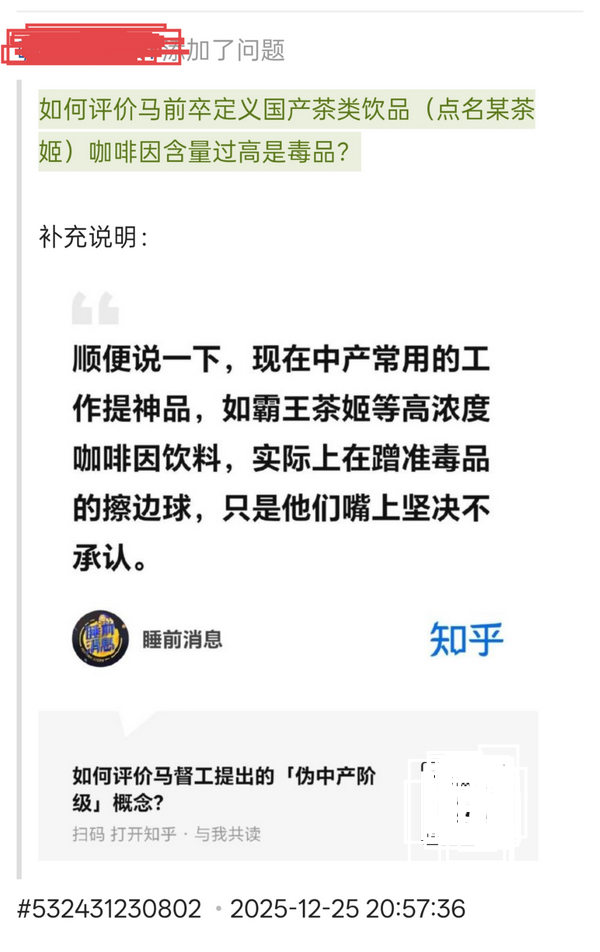我当晚一点左右看到这个问题,没有回答这个问题,因为能看出来是有明显引导和倾向式的提问,就去修改了题目,他提的这个问题暂且不谈是不是断章取义,篡改原意是肯定了,第二天问题冲上热榜,知乎官方修改了回答,锁定了问题。 这位提问的用户目前已经被知乎禁言了,有兴趣大家自己可以去查证一下。 目前鉴证的网友和普通大众对于这件事的态度完全不同,但没有任何一方是单纯支持霸王茶姬,鉴证群体只是因为反马支持霸王茶姬,大多数普通消费者压根也不会支持霸王茶姬。 现在霸王茶姬告与不告都已经无法解决公众对于奶茶咖啡因含量问题的新一轮大讨论乃至监管机构的介入。茶里有咖啡因并不像大部分人想象的那样是个常识,下面这个调研中,过半的消费者都不知道茶里有咖啡因,更别说奶茶咖啡因含量和咖啡一样,是红牛的两倍以上了,这就是在挑战和改变公众的现有认知。 |