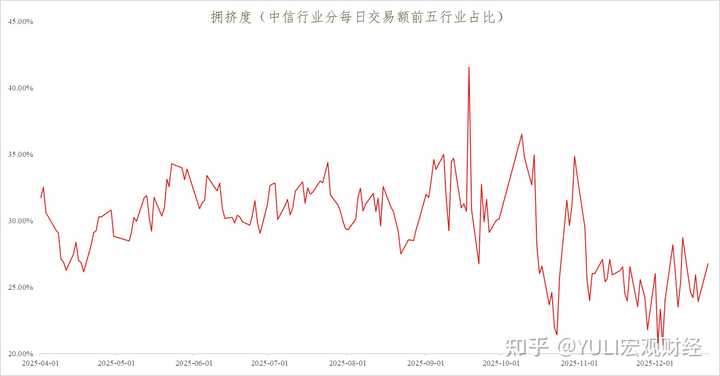 成交量放大,直观感受是市场里的钱变多了,或者说,钱流动得更快了。这可能是好事,说明流动性充裕,市场承载能力增强;但也可能是个警讯,如果成交量主要来自短线资金的频繁进出,那意味着市场的投机性在加剧,波动也会随之放大。 交易集中度来看,有19只个股今年的成交额超过了万亿。这些个股多数集中在科技、新能源等热门赛道,吸走了市场上相当一部分的活水。这19只股票的成交额加起来是个天文数字,它们的高换手率,反映的不仅是关注度高,更是巨大的分歧——有人极度看好,有人在剧烈博弈中获利了结。 另一个值得关注的数据是行业“拥挤度”。今年大部分时间,前五大热门行业的成交集中度徘徊在30%上下,在九月中旬一度冲高到41.57%,随后在十月末开始显著回落,年底已降至25%左右的水平。 |