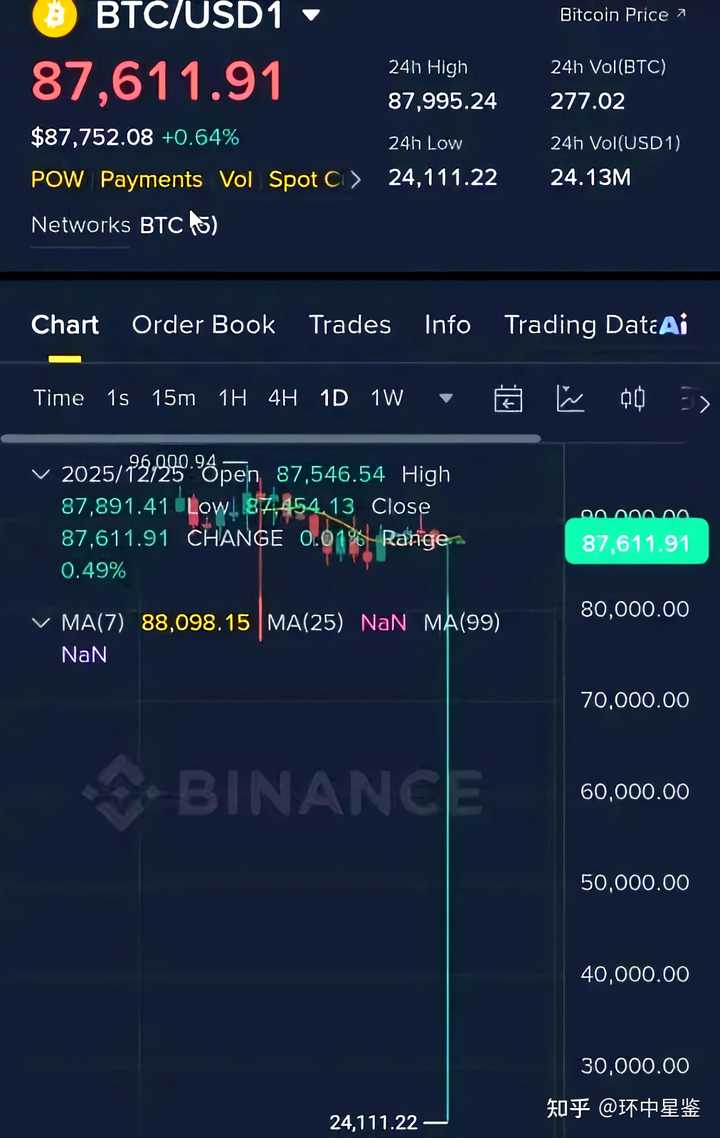 圣诞节那天比特币闪崩到24111美元,但不是整个市场崩盘,只是BTC/USD1交易对闪崩。几秒之后,这个交易对的价格就反弹到市价了。 当时主流交易所和高流动性的交易对,如BTC/USDT交易对的价格一直稳定在87000-88000美元。 |
