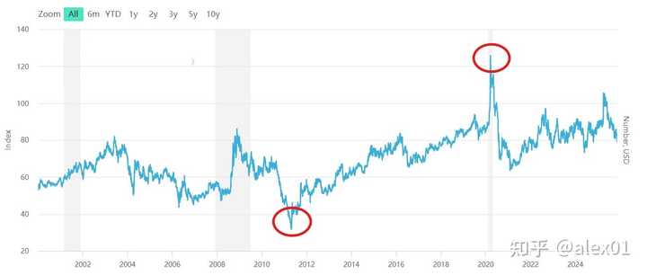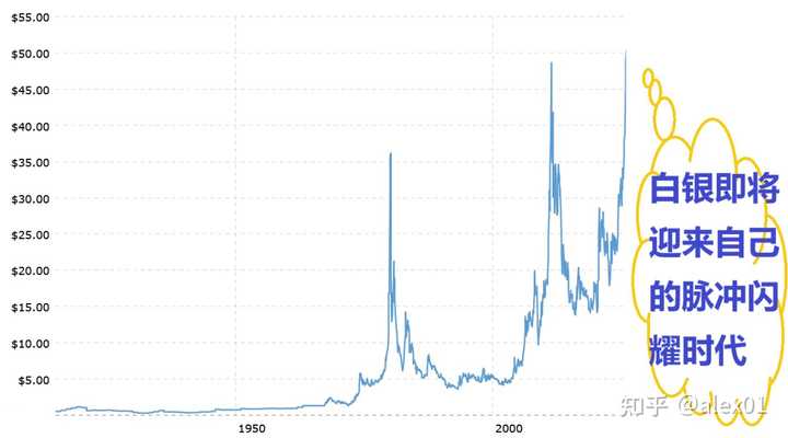 请注意图中的红色椭圆框框,在2011年后欧债危机安定后,市场的资金也非常充沛(美联储的QE放水也进行了好几轮),那么市场追逐风险,就会炒作白银。而在第二个2020年的框框中,市场极度恐慌,虽然美联储大放水,但是白银还是被严重抛售,金银比创下了历史新高。从这里也可以看出,白银不能当作货币来操作,更和恐慌无关,恐慌来临,优先被抛弃的是流动性更差的白银资产,因为没有人会拿白银去买东西。 这是白银的百年走势图。 |