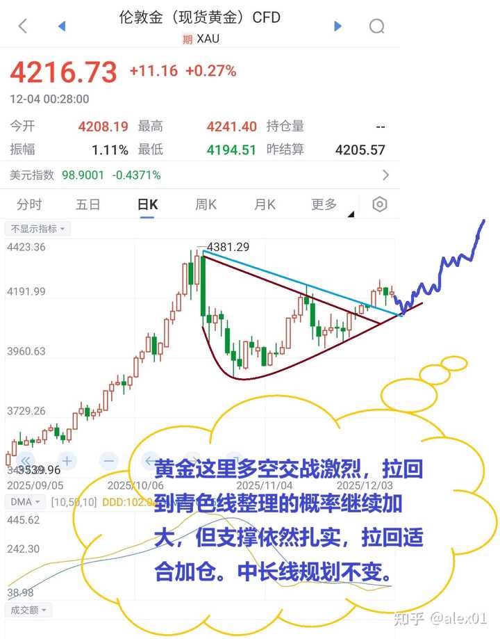 三》关于黄金: 黄金依旧强势,但触及4200美元/盎司的压力关卡,拉回整理非常正常,两道支撑位不破,都无需担心。第一道支撑不破属于强势整理。如果支撑不破,就是加仓的好时机。 如果回撤,维持在4040-4200间震荡即可,然后支撑不破的话,最快一周内就会创历史新高。 下一个目标就是5000美元/盎司(约1150元/克),且中间不会过多纠缠停留,不会给观望者以更多机会。 如果跌破4040美元/盎司,短线就有大风险,届时我们再来规划。 |