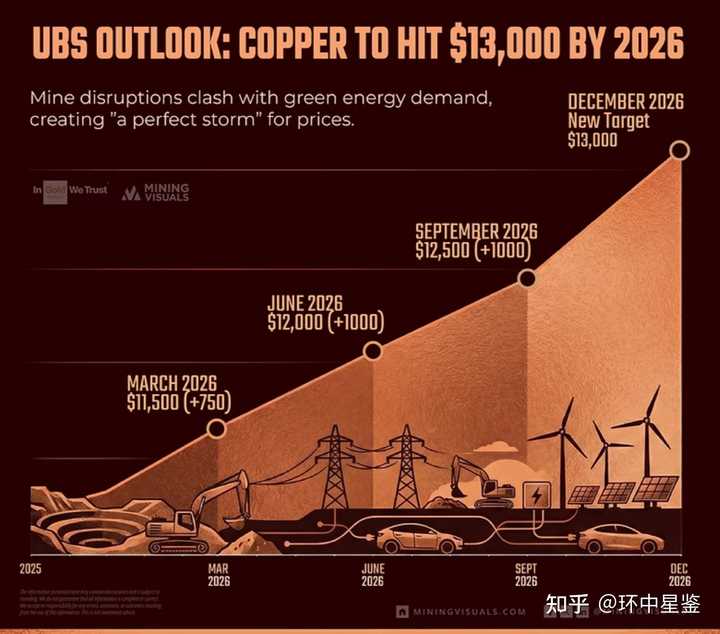 供需缺口越来越大,铜价势必走高。 UBS把2026年铜的目标价,调高至1.3万美元/吨。 |