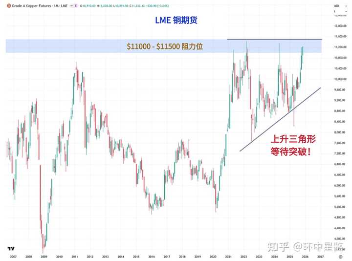 说实在的,这个价格估得相当保守。 LME的铜期货已经创下11705美元/吨的历史新高,正等着突破2021年起形成上升三角形态。 放着那么大的供需缺口,突破三角形态只是时间问题。 |