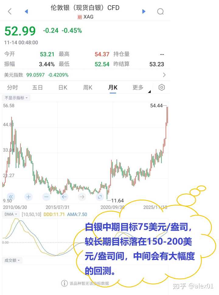 以下是白银的重申: 本轮白银在没有达到150美元/盎司前,任何回调皆买点。 白银如果创历史新高后,那么白银这波的中期目标定在75美元/盎司,较长期目标定在150-200美元/盎司间。 当然,先提醒,白银的泡沫破裂后,跌幅也是很惨烈的,跌到10美元/盎司都是有可能的。 操作白银,要非常小心,资金占比我建议不要超过贵金属总仓位的1/3,最好不要加杠杆,优先选择slv这样的ETF,其次是银矿,期货和期权最好都设好防守位和对冲标的。 关于期权和期货,请参阅这篇: 二》为什么这里规划? 1)白银的基本面众说纷纭,白银的产量在冶炼铅 锌 铜的工厂里面按吨产出,应该也是事实。但所谓的白银限制出口也是事实。也就是,时代选择了白银作为炒作的标的物,资金 白银自身的价格 和历史传统也支持白银作为炒作的标的物。 因此,操作白银,请忘记白银的货币属性,现阶段主要比拼的是筹码。 关于白银为什么不能当作货币来操作,长期持有,亏钱了就埋入地窖,传给子孙。稍后解释。 2)技术面: 以下是近20多年的金银比示意图(金银价格相除的数值)。 |