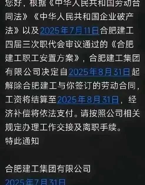 2025年7月31日,合肥建工集团的员工们收到了一条短信: |