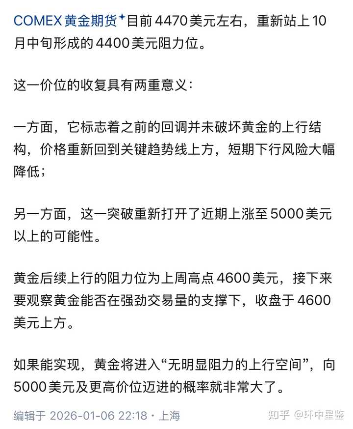 我帮大家看着,目前还没有站稳4600,只是轻轻摸了一下,关键要看能否放量站稳4600。 为什么4600美元/盎司那么重要?考考大家。 因为站稳4600以后,黄金冲5200,前方一马平川! 其实今天没什么特别要更新的,除了文章最后讲一下著名的“一月金价季节性上涨”。 最近金价的趋势,其实在之前的回答里,都讲清楚了。 一个个来: 首先,12月25日的回答,关键是想让大家知道已经站稳4400美元,黄金正式开启冲击5200美元以上。 第二个,12月的30日的回答,气氛紧张,金价被白银带崩,跌破4400,中断了本来很好的上升势头。加上各路媒体的渲染,当时挺多人开始慌了。 这个回答里,明确讲了下跌的支撑位在4300美元,以及长期牛市没有改变,不用恐慌。 第三个,1月6日,金价4470左右,重新站上4400美元关键阻力位。 那天技术面已经很稳,所以我说得很具体,关键是下面这段文字。 当时最重要的是想让大家知道,4600美元是冲5000以上最最最关键的阻力,一旦冲破站稳,意味着黄金涨到5200美元以上,几乎毫无阻碍! |
