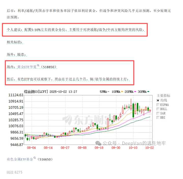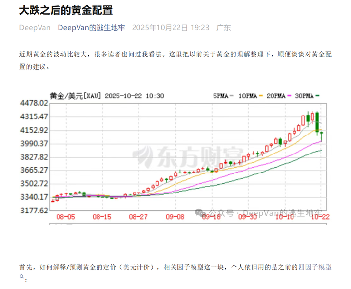 还是按我之前的四因子模型来解析: 美国利率,战争和地缘政治风险,美国通胀率,美国财政状况和债务率。 我不预测具体的价格,不过我自己是做全天候宏观策略的,大致的方向还是能看到。 这是10月22日,黄金大跌后写的。当时依旧建议配置10%左右的黄金 大跌之后的黄金配置 |