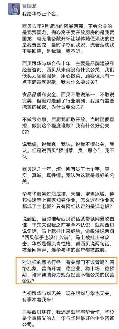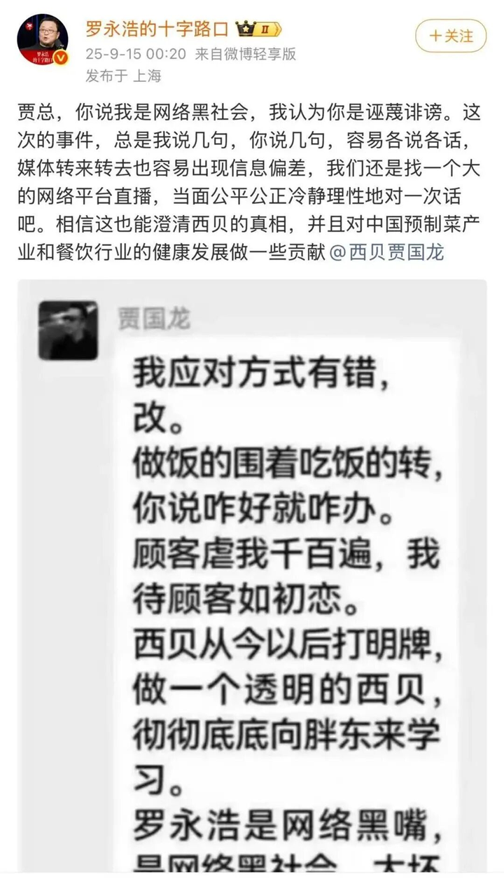 说真的,事情到这里已经算是魔幻了。 6. 但,还有高手。 本来最近西贝的风波已经平静了,都没这事儿了。 甚至西贝关店这事儿本身是示弱的好机会。 不行,贾老师就连关店都要再蹦出来教育消费者西蓝花,预制菜,以及骂罗老师。 |
