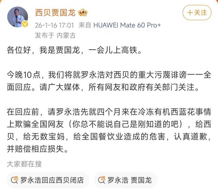 贾老师是不是跟西贝有仇啊?怎么每次对西贝的最大伤害都是他打出来的? 都2026年了怎么这个事情还有新剧情啊? 西贝的事情到今天已经超越了魔幻,到了黑色幽默的地步了。 1. 一开始,罗永浩日常吐槽一下,他日常要发几十条乱七八糟的微博,不理会就是了。 |