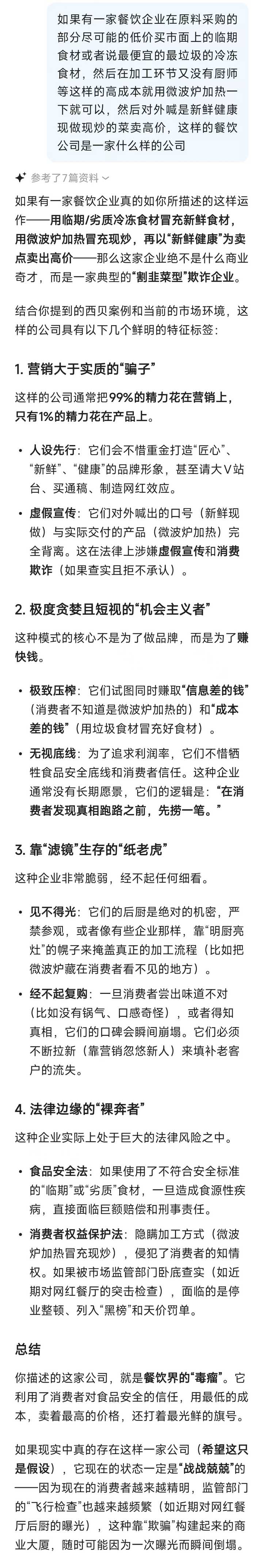 如果有一家餐厅,按照如下方法经营,你觉得它该不该垮: 1、采购环节:尽可能以最低价买食材,比如用地摊都嫌差的元宝油,买浓汤宝伪装鸡汤,冷冻一年的羊肉,冷冻两年的蔬菜。甚至是不是大量采购临期食材,也不清不楚。 2、加工环节:店面电磁炉微波炉加热为主,不需要会做菜的,省掉薪酬最高的厨师费用,用比服务员还低的工资,招聘一批微波炉操作员,这样又店面连燃气费都省掉了。员工再都不上社保,又能省一笔。最大的资产就一排排冷冻柜。 3、销售环节:高举“新鲜、健康、现场现做”,骗消费者,尽可能卖比现炒菜还高的价,行坑蒙拐骗之实。 请问,这是什么生意模式?是不是偷鸡摸狗赚黑心钱模式? 这样的餐饮企业,该不该垮?该不该死? 这是阿里巴巴旗下千问大模型给出的回答,我觉得是比较客观和准确的。 |